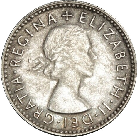 The 1957 Queen Elizabeth II Sixpence coin, engraved by Mary Gillick, and made of silver (.500). Weighing 2.83 grams, with a diameter of 19 mm, and a thickness of 1.29 mm, and featuring a reeded edge.