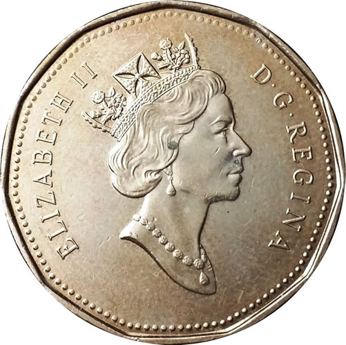 The 1990 Queen Elizabeth II Dollar coin, has a total mintage of 68,402,000, struck at the Royal Canadian Mint mint, and engraved by Susan Taylor. Made of brass plated steel, weighing 6.27 grams, with a diameter of 26.5 mm, and a thickness of 1.95 mm, and featuring a smooth edge.