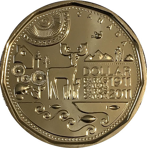 The 2011 Parks Canada Queen Elizabeth II Dollar coin, struck at the Royal Canadian Mint mint, engraved by Susan Taylor, and made of brass plated steel. Weighing 6.27 grams, with a diameter of 26.5 mm, and a thickness of 1.95 mm, and featuring a smooth edge.