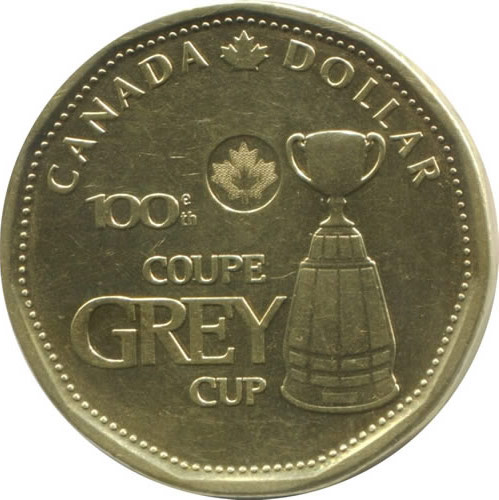 The 2012 Grey Cup Queen Elizabeth II Dollar coin, struck at the Royal Canadian Mint mint, engraved by Susan Taylor, and made of brass plated steel. Weighing 6.27 grams, with a diameter of 26.5 mm, and a thickness of 1.95 mm, and featuring a smooth edge.