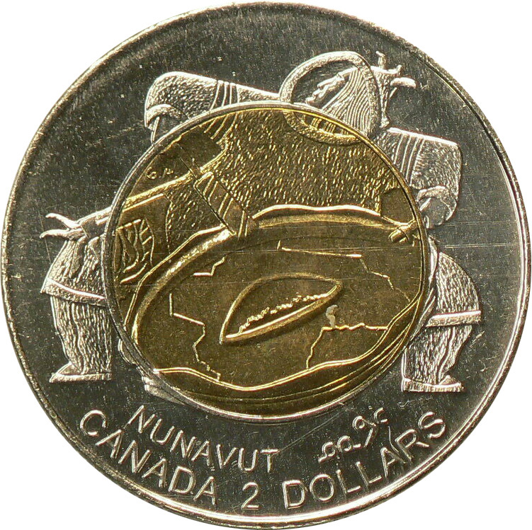 The 1999 Nunavut Queen Elizabeth II Two Dollars coin, struck at the Royal Canadian Mint mint, engraved by Susan Taylor, and made of bimetallic: brass plated aluminium-bronze centre in nickel plated steel ring. Weighing 6.92 grams, with a diameter of 28 mm, and a thickness of 1.75 mm, and featuring a segmented reeding and incuse lettering position a - edge lettering with obverse on top position b - edge lettering with reverse on top edge.