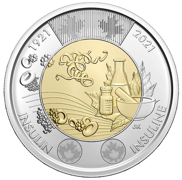The 2021 Insulin Queen Elizabeth II Two Dollars coin, struck at the Royal Canadian Mint mint, engraved by Susan Taylor, and made of bimetallic: brass plated aluminium-bronze centre in nickel plated steel ring. Weighing 6.92 grams, with a diameter of 28 mm, and a thickness of 1.75 mm, and featuring a segmented reeding and incuse lettering