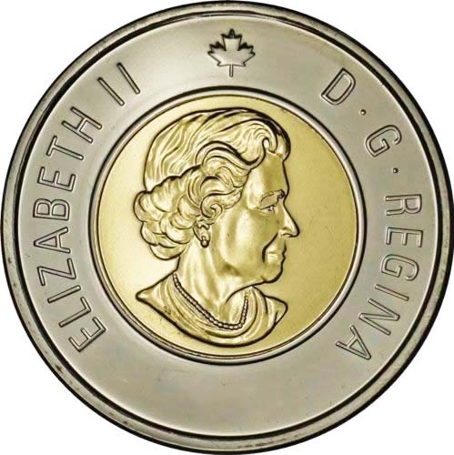 The 2022 Queen Elizabeth II Two Dollars coin, struck at the Royal Canadian Mint mint, engraved by Susan Taylor, and made of bimetallic: brass plated aluminium-bronze centre in nickel plated steel ring. Weighing 6.92 grams, with a diameter of 28 mm, and a thickness of 1.75 mm, and featuring a segmented reeding and incuse lettering