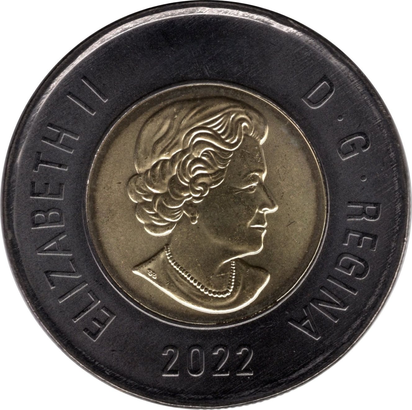 The 2022 Posthumous Queen Elizabeth II Two Dollars coin, struck at the Royal Canadian Mint mint, engraved by Susan Taylor, and made of bimetallic: brass plated aluminium-bronze centre in nickel plated steel ring. Weighing 6.92 grams, with a diameter of 28 mm, and a thickness of 1.75 mm, and featuring a segmented reeding and incuse lettering