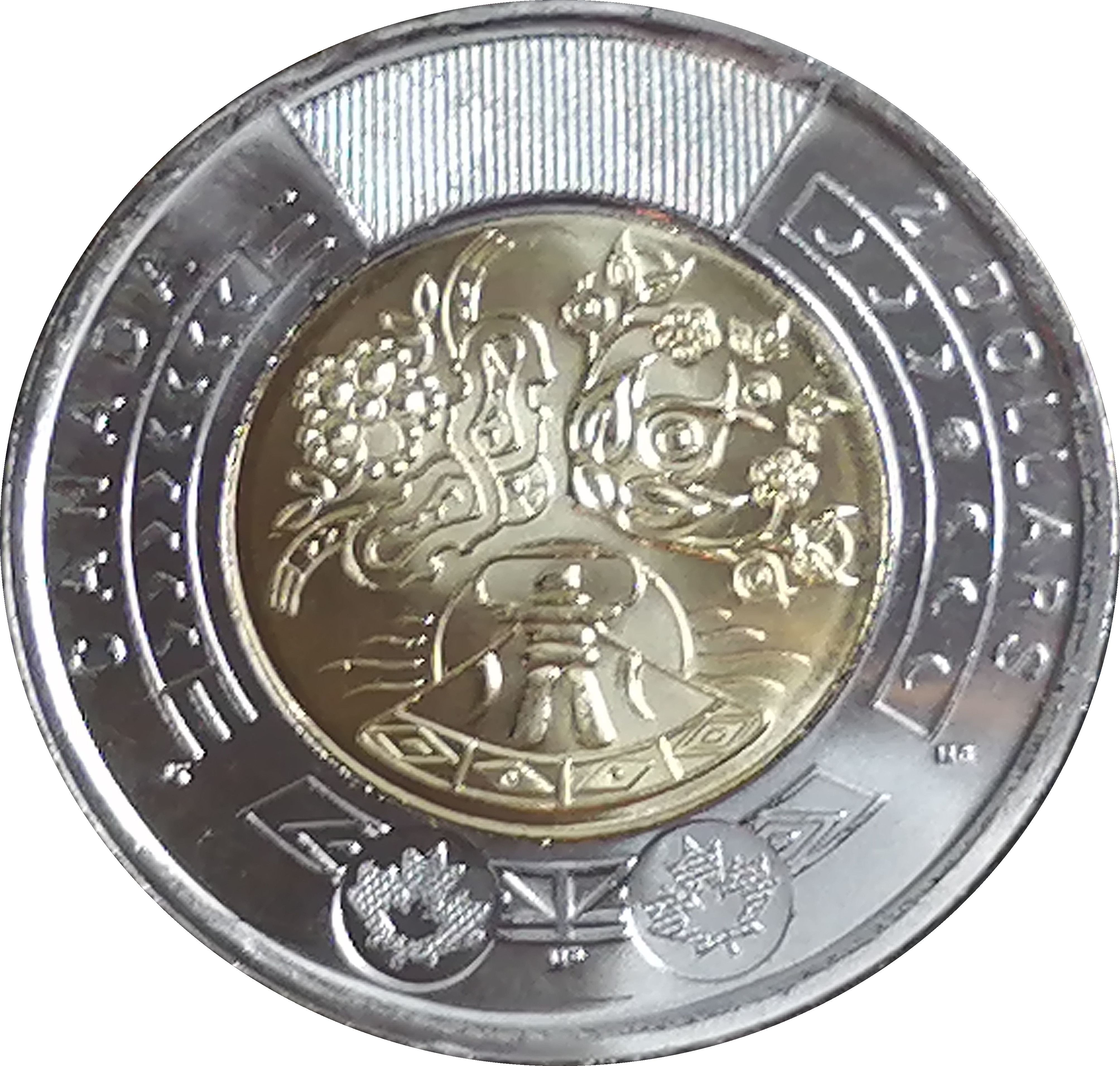 The 2023 Indigenous Peoples Day Queen Elizabeth II Two Dollars coin, struck at the Royal Canadian Mint mint, engraved by Susan Taylor, and made of bimetallic: brass plated aluminium-bronze centre in nickel plated steel ring. Weighing 6.92 grams, with a diameter of 28 mm, and a thickness of 1.75 mm, and featuring a segmented reeding and incuse lettering