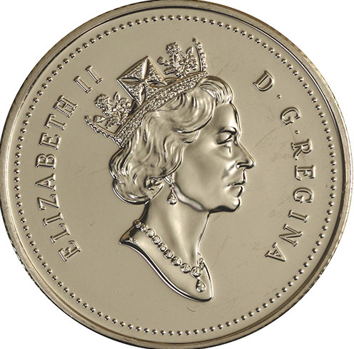 The obverse is head of queen elizabeth ii, as at 77 years of age, bare headed, wearing necklace and earrings, facing right. It reads “ELIZABETH II D·G·REGINA P”. The reverse is a caribou is accompanied with the face value and surrounded with the inscription "canada" and the date. It reads “CANADA 2003 25 Cents H”.