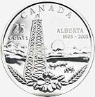The 2005-CAP Alberta Centennial Queen Elizabeth II Modern 25 Cents coin, struck at the Ottawa, Ontario, Canada mint, engraved by Susan Taylor, and made of nickel plated steel. Weighing 4.43 grams, with a diameter of 23.88 mm, and a thickness of 1.58 mm, and featuring a reeded edge.