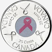 The 2006-CAP Breast Cancer Awareness First Day Strike Queen Elizabeth II Modern 25 Cents coin, struck at the Ottawa, Ontario, Canada mint, engraved by Susan Taylor, and made of nickel plated steel. Weighing 4.43 grams, with a diameter of 23.88 mm, and a thickness of 1.58 mm, and featuring a reeded edge.