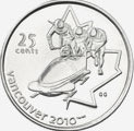 The 2008 Bobsleigh Queen Elizabeth II Modern 25 Cents coin, struck at the Royal Canadian Mint mint, engraved by Susan Taylor, and made of nickel plated steel. Weighing 4.43 grams, with a diameter of 23.88 mm, and a thickness of 1.58 mm, and featuring a reeded edge.