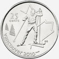 The 2009 Cross-Country Skiing Queen Elizabeth II Modern 25 Cents coin, struck at the Royal Canadian Mint mint, engraved by Susan Taylor, and made of nickel plated steel. Weighing 4.43 grams, with a diameter of 23.88 mm, and a thickness of 1.58 mm, and featuring a reeded edge.