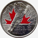 The 2009 Men's Ice Hockey, Enameled Queen Elizabeth II Modern 25 Cents coin, struck at the Royal Canadian Mint mint, engraved by Susan Taylor, and made of nickel plated steel. Weighing 4.43 grams, with a diameter of 23.88 mm, and a thickness of 1.58 mm, and featuring a reeded edge.