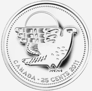 The 2011 Falcon Proof Queen Elizabeth II Modern 25 Cents coin, struck at the Royal Canadian Mint mint, engraved by Susan Taylor, and made of nickel plated steel. Weighing 4.43 grams, with a diameter of 23.88 mm, and a thickness of 1.58 mm, and featuring a reeded edge.
