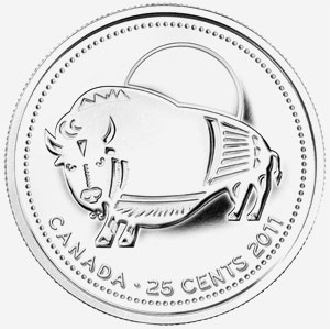 The 2011 Wood Bison Queen Elizabeth II Modern 25 Cents coin, struck at the Royal Canadian Mint mint, engraved by Susan Taylor, and made of nickel plated steel. Weighing 4.43 grams, with a diameter of 23.88 mm, and a thickness of 1.58 mm, and featuring a reeded edge.