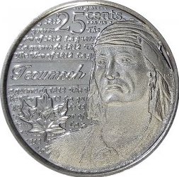The 2012 Tecumseh Proof Queen Elizabeth II Modern 25 Cents coin, struck at the Royal Canadian Mint mint, engraved by Susan Taylor, and made of nickel plated steel. Weighing 4.43 grams, with a diameter of 23.88 mm, and a thickness of 1.58 mm, and featuring a reeded edge.