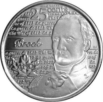 The 2012 Sir Isaac Brock Queen Elizabeth II Modern 25 Cents coin, struck at the Royal Canadian Mint mint, engraved by Susan Taylor, and made of nickel plated steel. Weighing 4.43 grams, with a diameter of 23.88 mm, and a thickness of 1.58 mm, and featuring a reeded edge.