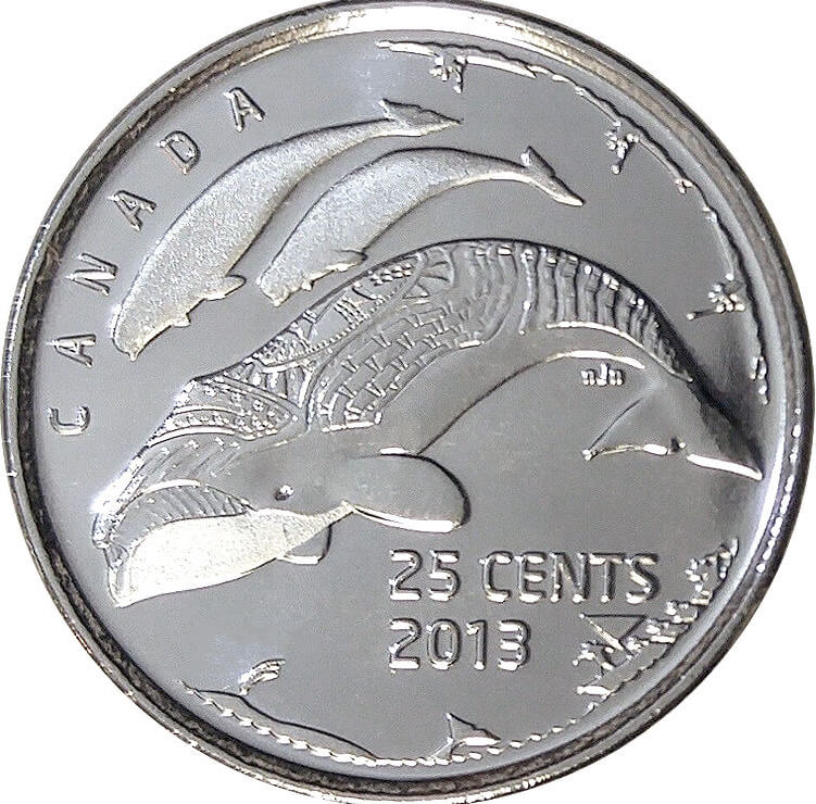 The 2013 Whales Queen Elizabeth II Modern 25 Cents coin, struck at the Royal Canadian Mint mint, engraved by Susan Taylor, and made of nickel plated steel. Weighing 4.43 grams, with a diameter of 23.88 mm, and a thickness of 1.58 mm, and featuring a reeded edge.