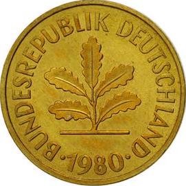- The 1950-F Bundesrepublik Deutschland 5 Pfennigs was struck at the Stuttgart, Germany mint.