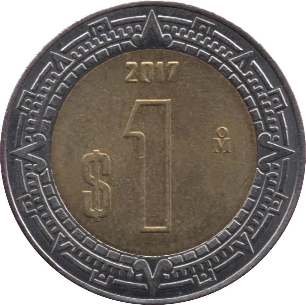 The obverse is the national emblem of mexico depicting a mexican golden eagle perched on a prickly pear cactus devouring a snake above a half-wreath of oak and laurel below and the legend “estados unidos mexicanos” forming the upper semicircle. It reads “ESTADOS UNIDOS MEXICANOS”. The reverse is at center, the denomination $1 with the date above and the mint mark ṁ to the right. on the outer ring, the stylized designs from the ring of splendor (anillo del resplandor) on the aztec calendar stone (piedra del sol). It reads “2019 $1 Mo”.