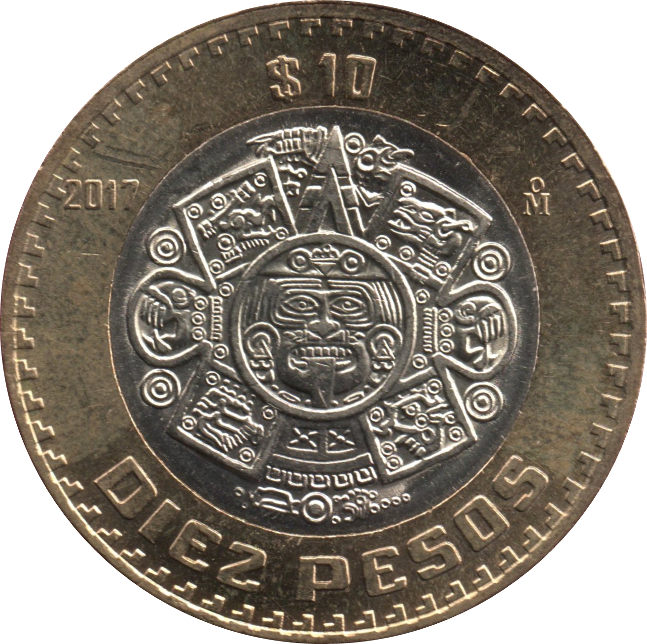 The obverse is the national arms of mexico (an eagle on cactus facing left with a snake in beak above wreath), with the inscription forming a semicircle above. It reads “ESTADOS UNIDOS MEXICANOS”. The reverse is in the center there is the circle of the aztec sun stone representing tonatiuh with the fire mask. in the peripheral ring at top center the value; to the left the mint year, and to the right the mark of the mint of mexico "mo"; at the bottom, the face value in words. on most coins the inverted "l' shape ornament along the rim. see comments for details. It reads “$10 2019 Mo DIEZ PESOS”.