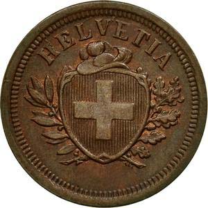 The obverse is coat of arms of switzerland on ornate shield. oak branch to the right. laurel branch to the left. hat with feather above. It reads “HELVETIA