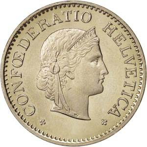 The obverse is head of libertas (roman goddess of liberty) facing right, with braided hair tied with ribbon and wearing tiara. It reads “CONFŒDERATIO HELVETICA