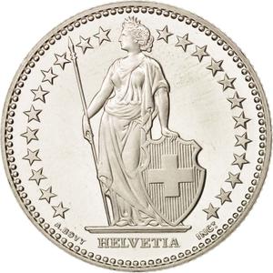 The obverse is full-length figure of helvetia, standing, facing left, wearing toga, holding spear in right hand, and supporting shield with coat of arms of switzerland with left hand. 22 stars around, representing the 22 cantons of the swiss confederation. in 1983, a 23rd star was added for the canton of jura, which was founded in 1979. It reads “HELVETIA A . BOVY INCᵀ.”. The reverse is wreath formed of oak and alpine rose branches tied with a ribbon below. It reads “2 Fr. 1968 B”.