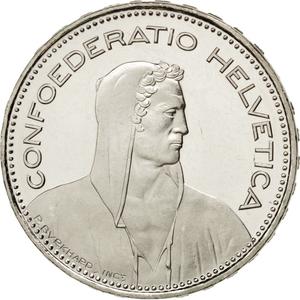 The 1968 Helvetia, Modern 5 Francs coin, struck at the Swiss Mint, Switzerland mint, and made of copper-nickel (75% copper, 25% nickel). Weighing 13.2 grams, with a diameter of 31.45 mm, and a thickness of 2.35 mm, and featuring a embossed lettering. edge.
