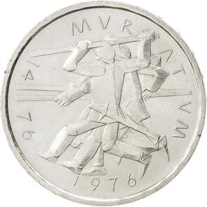 The 1976 Battle of Murten Helvetia, Modern 5 Francs coin, struck at the Swiss Mint, Switzerland mint, and made of copper-nickel (75% copper, 25% nickel). Weighing 13.2 grams, with a diameter of 31.45 mm, and a thickness of 2.35 mm, and featuring a embossed lettering. edge.