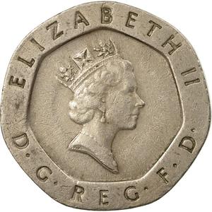 D·G·REG·F·D”. The reverse is crowned tudor rose dividing date and legend, denomination below. It reads “TWENTY PENCE