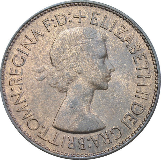 The obverse is young laureate portrait of queen elizabeth ii facing right, legend around. It reads “+ ELIZABETH·II·DEI·GRATIA·REGINA·F:D:
