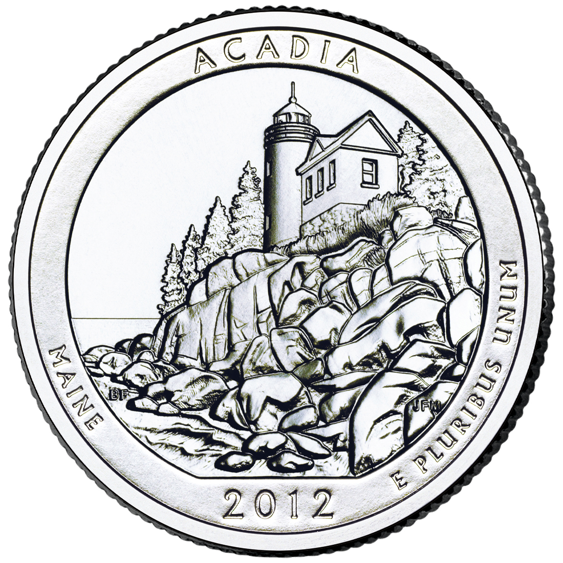 The 2012 Acadia America the Beautiful coin, has a total mintage of 25,400, struck at the Philadelphia, Pennsylvania mint, and made of silver (.999). Weighing 155.5 grams, with a diameter of 76.2 mm, and a thickness of 4.19 mm, and featuring a smooth with lettering edge.