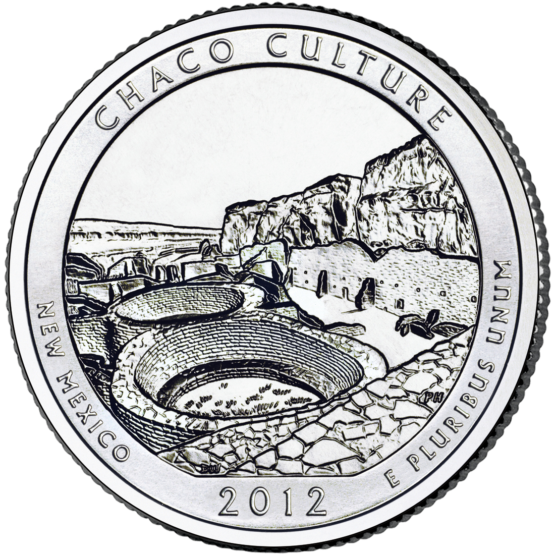 The 2012 Chaco Culture America the Beautiful coin, has a total mintage of 24,400, struck at the Philadelphia, Pennsylvania mint, and made of silver (.999). Weighing 155.5 grams, with a diameter of 76.2 mm, and a thickness of 4.19 mm, and featuring a smooth with lettering edge.