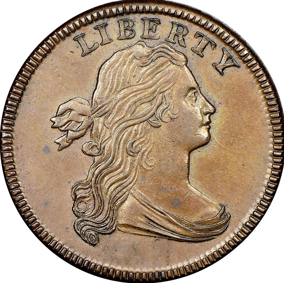 The 1796 'LIHERTY' Draped Bust Cent coin, struck at the Philadelphia, Pennsylvania mint, and engraved by Robert Scot. Made of copper, weighing 10.89 grams, with a diameter of 29 mm, and featuring a plain edge.