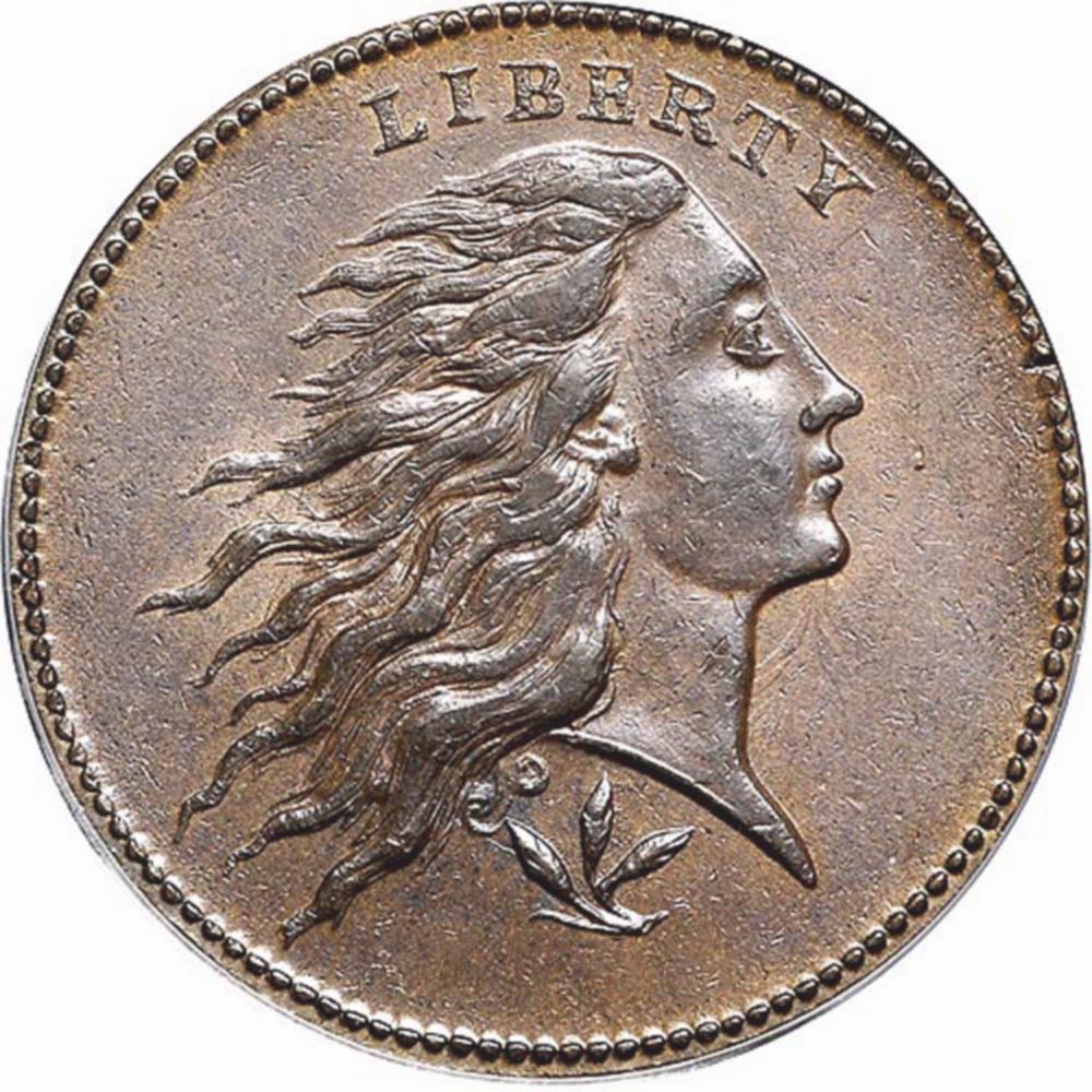 The obverse is the "flowing hair" liberty head on the right, and the vintage. in spite of a big work of remodelling of the head, this design did not meet more success. it was abandoned for good afterwards. there is a branch above the date. on some very rare pieces, there are strawberry leaves with a bud instead. see comments for more details.<span class="translated_info" data-details-id="d649928223c53e"><img src="/design/icones/translated.svg" alt="automatically translated" /></span><div id="d649928223c53e" class="translated_details" aria-hidden="true"><div class="translated_details_intro">this is an automatic translation. the original text is:</div><div lang="fr">la tête de la liberté dite "flowing hair" de droite, et le millésime. malgré un gros travail de remodelage de la tête, ce design ne rencontra pas davantage de succès. il fut abandonné définitivement après. il y a une branche au-dessus de la date. sur certaines pièces très rares, il y a plutôt des feuilles de fraisier avec un bourgeon. voir les commentaires pour plus de détails.</div></div>. It reads “LIBERTY 1793”. The reverse is the face value (in all letters) surrounded by a plant crown. this design was well received by the public. the fraction is now under the bow of the ribbon.<span class="translated_info" data-details-id="d649928223c724"><img src="/design/icones/translated.svg" alt="automatically translated" /></span><div id="d649928223c724" class="translated_details" aria-hidden="true"><div class="translated_details_intro">this is an automatic translation. the original text is:</div><div lang="fr">la valeur faciale (en toutes lettres) entourée d'une couronne végétale. ce design fut bien accueilli par le public. la fraction se trouve maintenant sous le noeud du ruban.</div></div>. It reads “UNITED STATES OF AMERICA ONE CENT 1/100”.