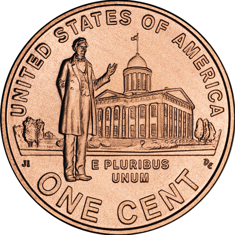 The obverse is right facing portrait of president abraham lincoln (1809-1865). It reads “IN GOD WE TRUST LIBERTY 2009 D VDB”. The reverse is lincoln standing in front of the state capitol building in springfield, illinois. It reads “UNITED STATES OF AMERICA JI E PLURIBUS UNUM DE ONE CENT”.