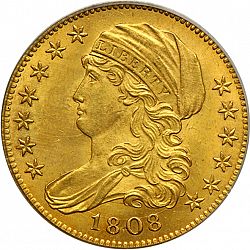 Once commonly referred to as a ‘Quarter Eagle,’ this denomination is now referred to as the ‘Capped Head’ series. The coin varies in appearance slightly from the time of its production. In the first year of its mintage, 1808, the reverse features an eagle without arrows. From 1813 to 1834, the Reverse Eagle appears with arrows and an olive branch in its talons.