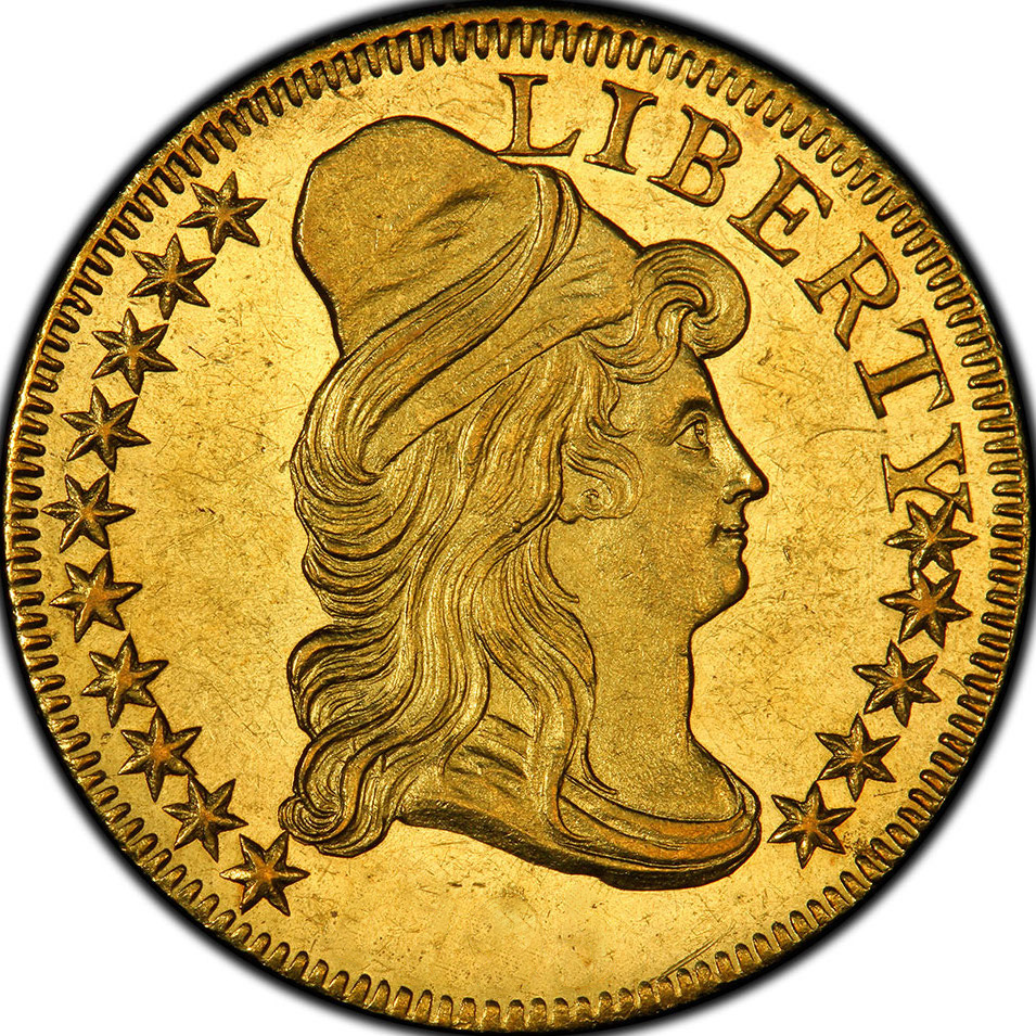 The obverse is capped bust right, 13 stars on the sides. It reads “LIBERTY 1798”. The reverse is heraldic eagle: bald eagle with wings outstretched, facing left holding ribbon with motto in beak, arrows held in talon on left and olive branch in talon on right; with shield on chest and with clouds and 13 stars above. It reads “UNITED STATES OF AMERICA E PLURIBUS UNUM”.