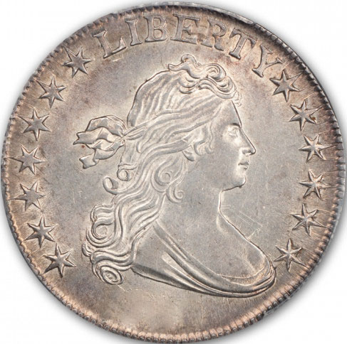 The Draped Bust Half Dollar was minted using the Coinage Act of 1792 and comprised of 90% silver. The coin was originally issued with a weight of 13.48 grams and diameter of 32.5 mm.