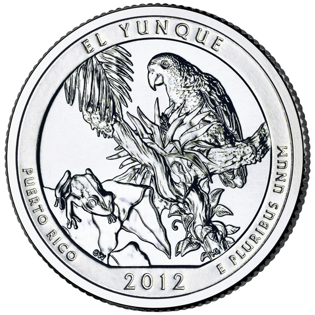 The 2012-P El Yunque America the Beautiful Quarters coin, has a total mintage of 25,800,000, struck at the Philadelphia, Pennsylvania mint, and engraved by John Flanagan. Made of copper-nickel clad copper, weighing 5.67 grams, with a diameter of 24.26 mm, and a thickness of 1.75 mm, and featuring a reeded edge.