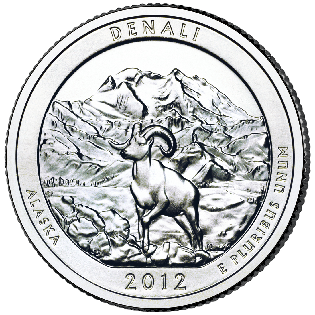The 2012-S Denali America the Beautiful Quarters coin, has a total mintage of 1,409,220, struck at the San Francisco, California mint, and engraved by John Flanagan. Made of copper-nickel clad copper, weighing 5.67 grams, with a diameter of 24.26 mm, and a thickness of 1.75 mm, and featuring a reeded edge.