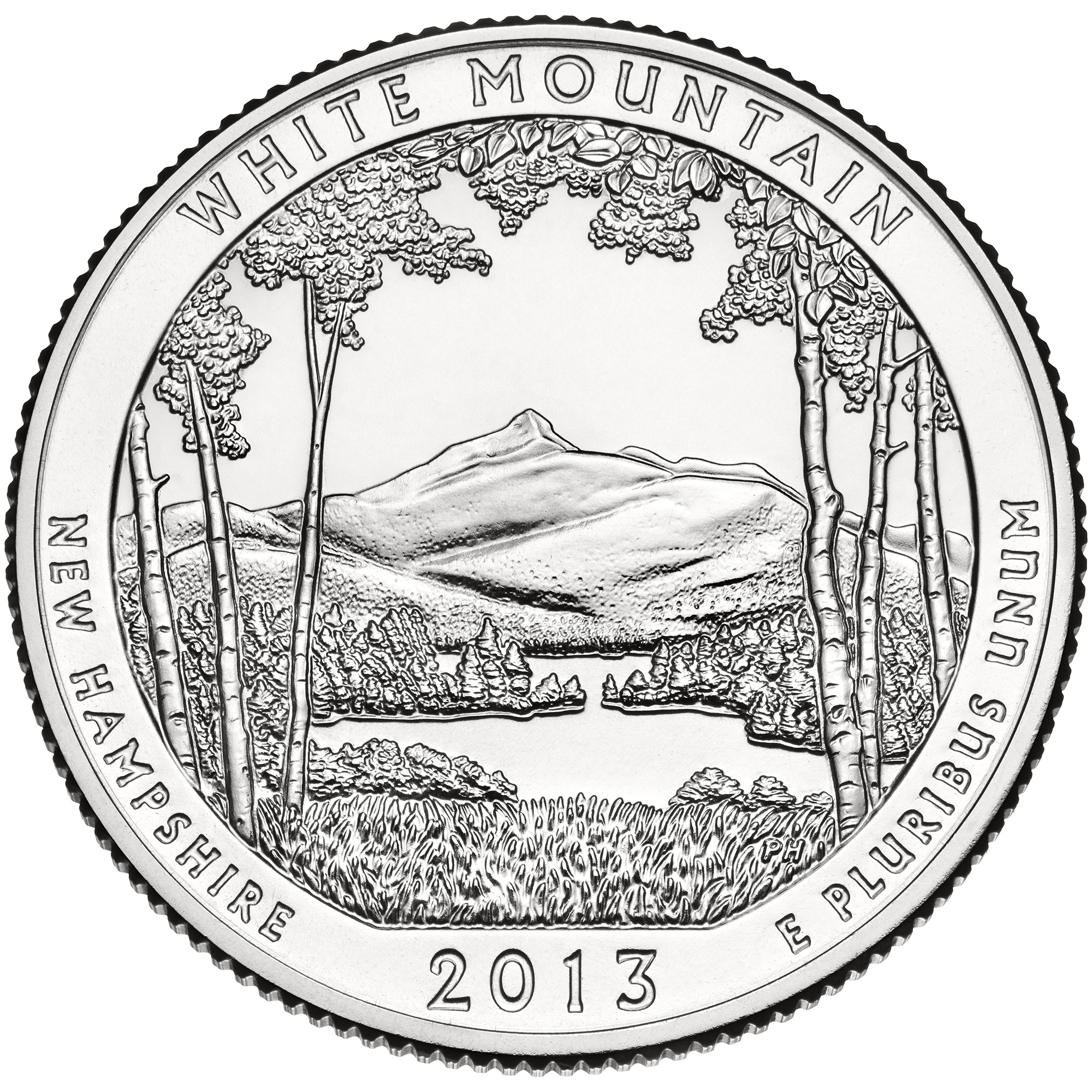 The 2013-D White Mountain America the Beautiful Quarters coin, has a total mintage of 107,600,000, struck at the Denver, Colorado mint, and engraved by John Flanagan. Made of copper-nickel clad copper, weighing 5.67 grams, with a diameter of 24.26 mm, and a thickness of 1.75 mm, and featuring a reeded edge.