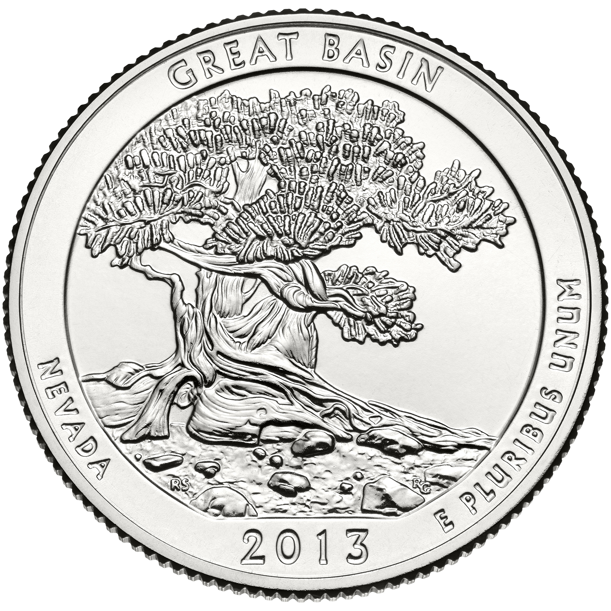 The 2013-P Great Basin America the Beautiful Quarters coin, has a total mintage of 122,400,000, struck at the Philadelphia, Pennsylvania mint, and engraved by John Flanagan. Made of copper-nickel clad copper, weighing 5.67 grams, with a diameter of 24.26 mm, and a thickness of 1.75 mm, and featuring a reeded edge.