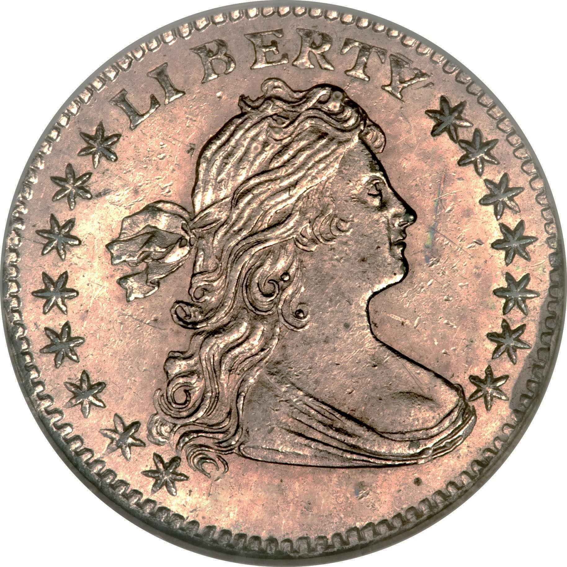 The obverse is draped bust right, flanked by stars. It reads “LIBERTY 1796”. The reverse is small eagle surrounded by wreath. It reads “UNITED STATES OF AMERICA”.